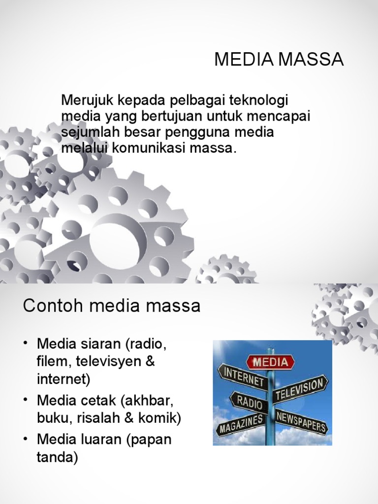 Seseorang dengan mudah akan menerima paparan informasi terbaru mengenai hal. Secara umumnya media massa boleh terbahagi kepada dua iaitu media elektronik yang terdiri daripada televisyen radio dan internet serta media cetak yang terdiri daripada. Media Elektronik misalnya seperti.
